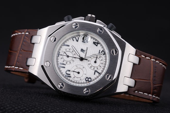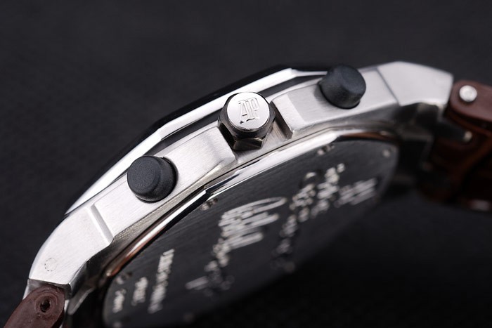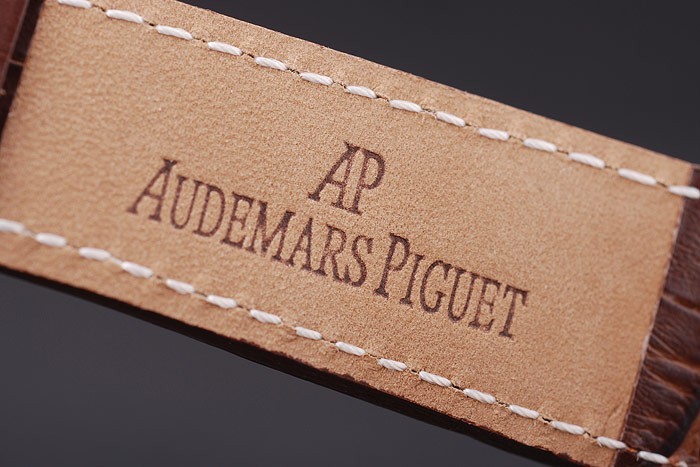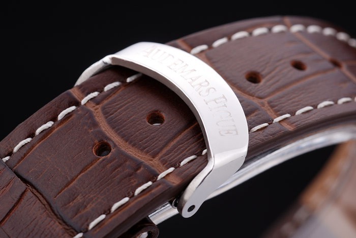 Bransoletka: ciemnobrązowy skórzany pasek krokodyla z białą nitką i wytłoczoną ciepłem Nazwa i logo Audemars Piguet oraz Audemars Piguet wpisane ze stali nierdzewnej zapięcie