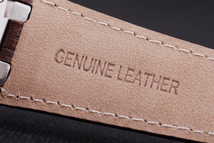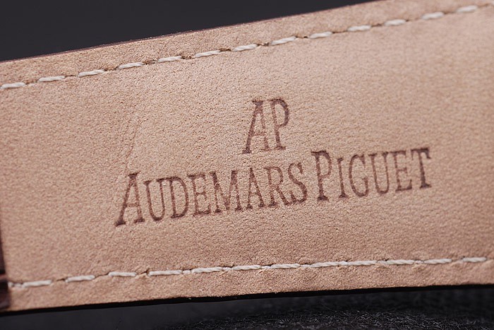 Bransoletka: Brązowy skórzany pasek krokodyla z białą nitką zszywaniem i wytłoczonym ciepłem Nazwa i logo Piguet oraz Piguet Audemars wpisany na stal nierdzewną zapięcie