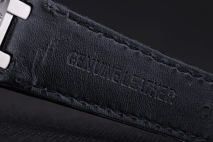 Bransoletka: czarny skórzany pasek krokodyla z białym szwaniem i wytłoczonym ciepłem nazwa i logo Audemars oraz logo Audemars wpisane ze stali nierdzewnej zapięcie