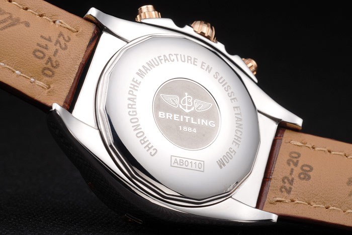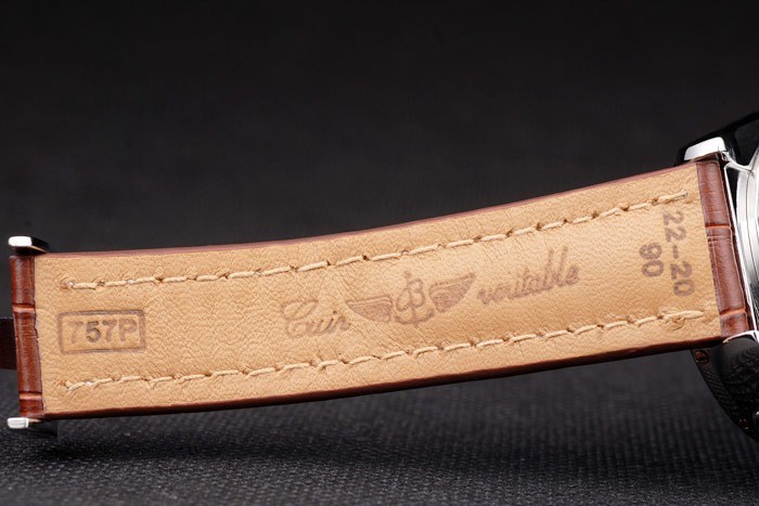 Bransoletka: Brązowy skórzany pasek krokodylowy z patentowym białym szwem i wytłoczonymi cieplnymi rycałami Breitling i grawerowaną ze stali nierdzewnej z logo Breitling na górze