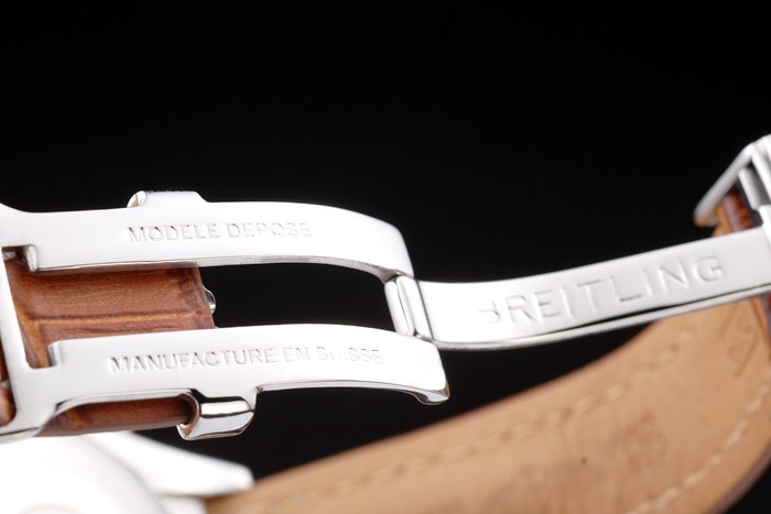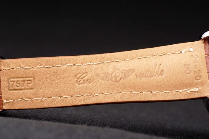 Bransoletka: Brązowy skórzany pasek krokodyla z patentowym białym szwem i wytłoczonymi cieplnymi rycałami Breitling i grawerowaną ze stali nierdzewnej z logo Breitling na górze
