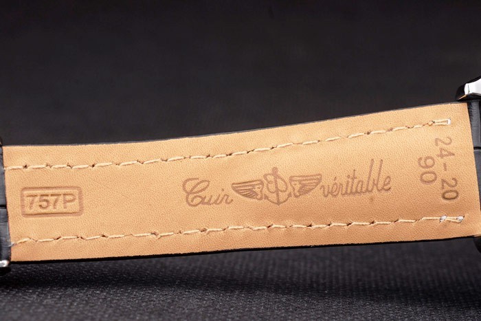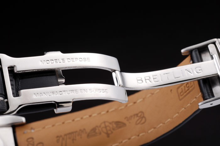 Bransoletka: Czarny skórzany pasek krokodyla z patentowym białym szwem i wytłoczonymi cieplnymi rycałami Breitling i grawerowaną stalową stalową złożoną z logo Breitling na górze