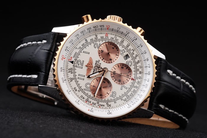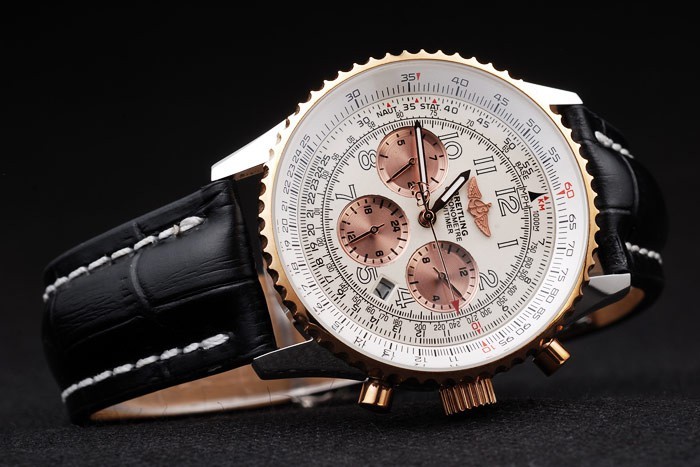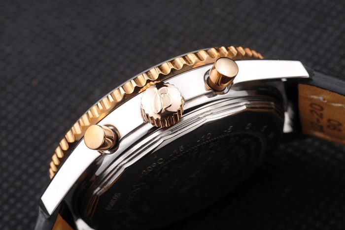 Bransoletka: Czarny skórzany pasek krokodyla z patentowym białym szwem i wytłoczonymi cieplnymi rycałami breitlingowymi i grawerowanymi ze stali nierdzewnej Zamknięte zapięciem z logo Breitling na górze