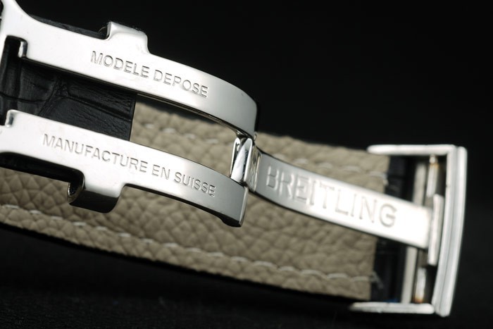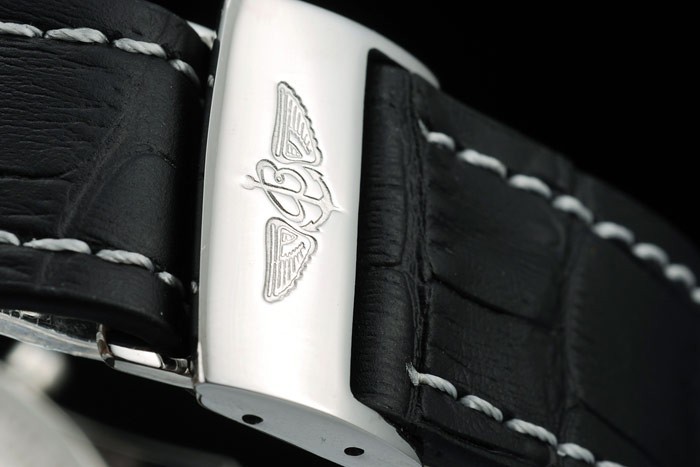 Bransoletka: Czarny skórzany pasek krokodyla z patentowym białym szwem i wytłoczonymi cieplnymi rycinami Breitling i grawerowaną ze stali nierdzewnej Zamknięcie z logo Breitling na górze