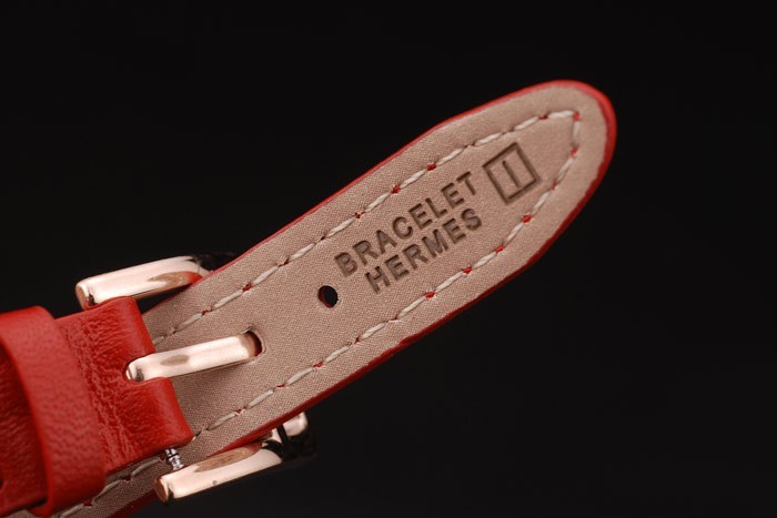 Bransoletka : Wydłużony czerwony skórzany pasek z wytłoczoną cieplną bransoletką znaczkową Hermes i Hermes Roses-Gold Pleaded Hook-Buckle Cnap