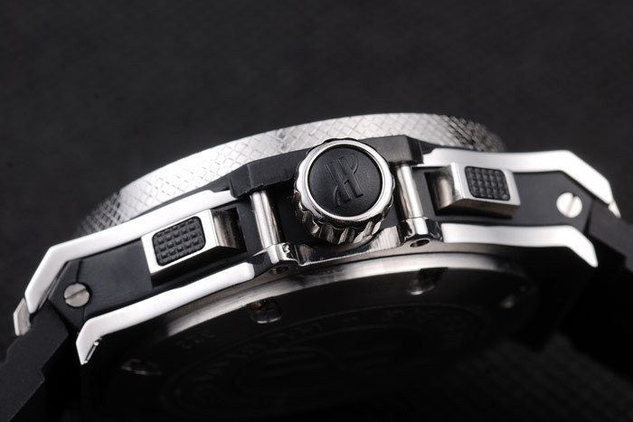 Korona: Wypolerowana korona ze stali nierdzewnej ze stali nierdzewnej z grawerowaniem i dwiema prostokątnymi koronami przycisku po obu stronach , wszystkie zbite z czarnymi gumowymi ozdobami