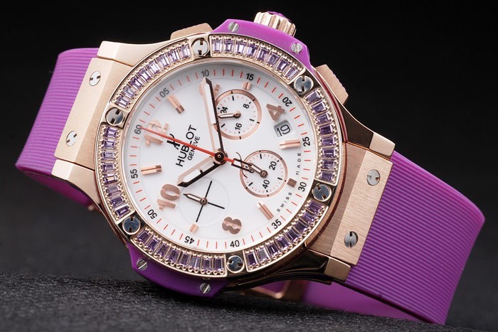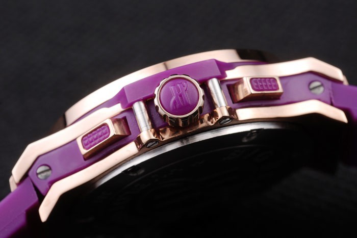 Crown: Crown Rose-Rose-Gold Crown z grawerowaniem „H” i dwa prostokątne przyciski przyciskowe Korony po obu stronach, wszystkie wysadzane fioletowymi ozdobami gumowymi