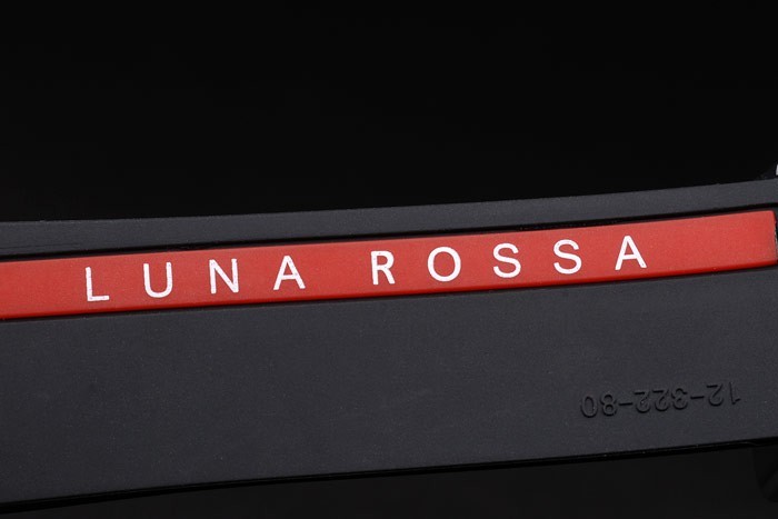 Bransoletka: teksturowana czarna gumowa opaska ze stali nierdzewną zapięcie na przyciski, grawerowanie z wytłoczonym czerwonym księżycem i inskrypcje Hublot