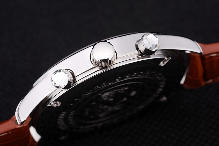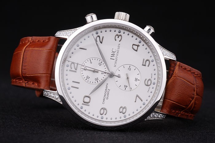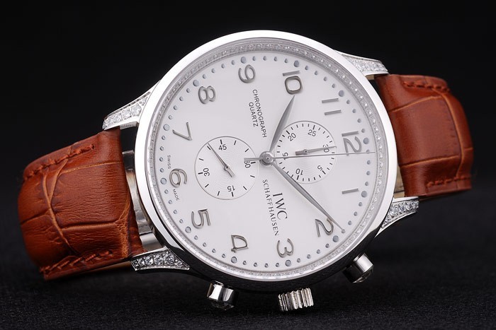 Korona: Wypolerowana stalowa stalowa korona z grawerowaniem logo IWC i dwie mniejsze okrągłe korony przyciskowe po obu stronach