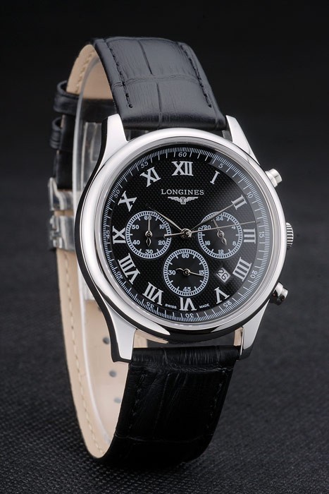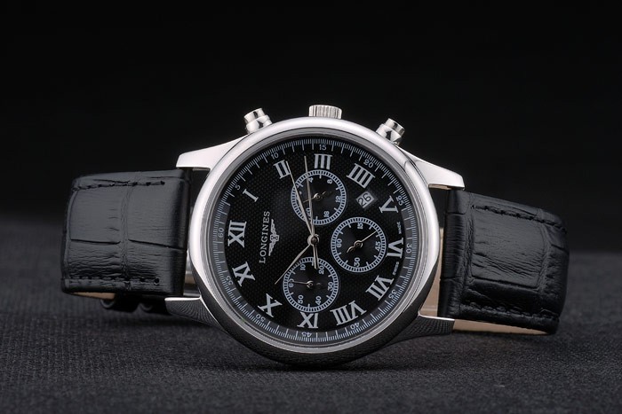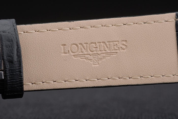 Wykładany czarny skórzany pasek krokodyla z logo Lonines wpisane i wypolerowane zaczep ze stali nierdzewnej
