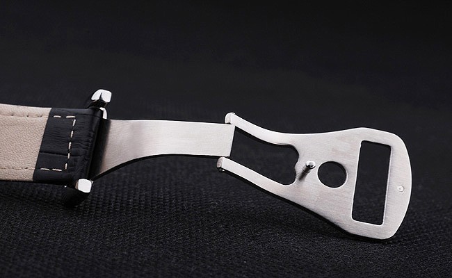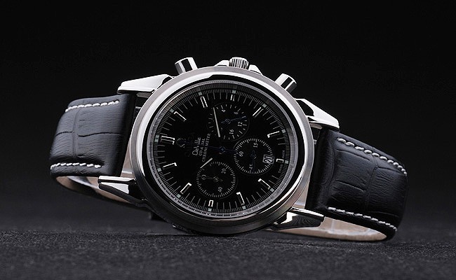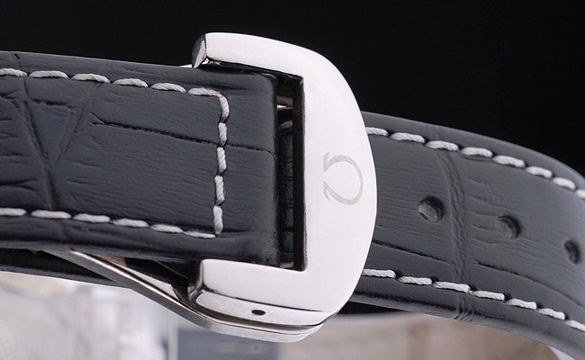 Bransoletka: Czarny skórzany pasek krokodyla z białym ściegiem i logo Omega wygrawerowane ze stali nierdzewnej zapięcie za haczyek