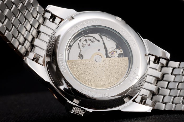 Powrót: obudowa pchania ze stali nierdzewnej z tyłu z napisami Omega i przezroczystym centrum ujawnia, że mechanicy w