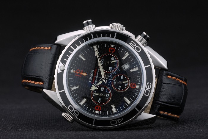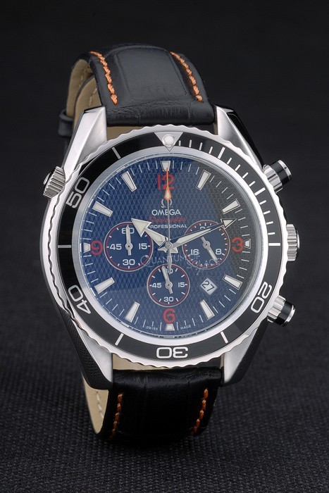 Bransoletka: pomarańczowy czarny skórzany pasek z wytłoczonym na ciepło znaczek omega i wypolerowane zapięcie ze stali nierdzewnej z logo Omega na górze