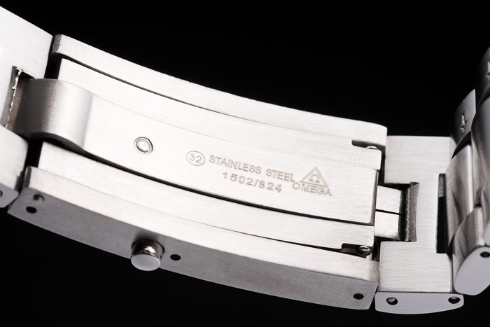 Crown: Brushed stainless steel cutwork crown with Omega logo plus an additional crown on the opposite top corner