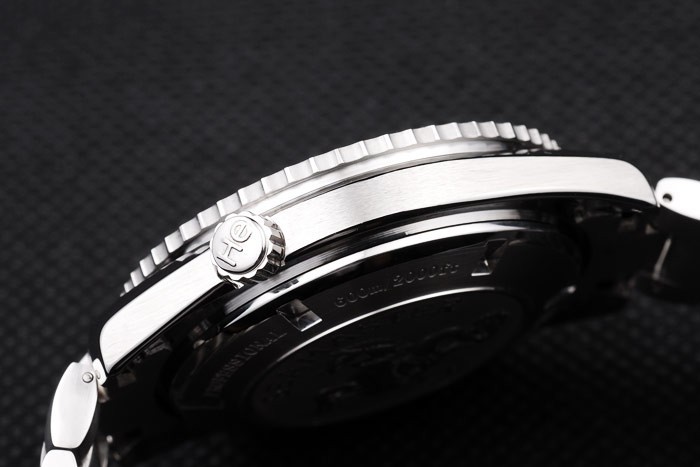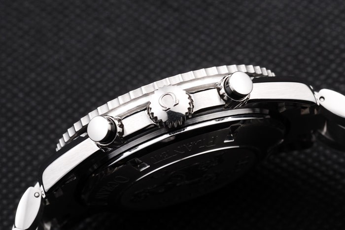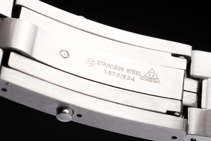 Crown: Brushed stainless steel cutwork crown with Omega logo plus an additional crown on the opposite top corner