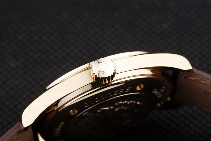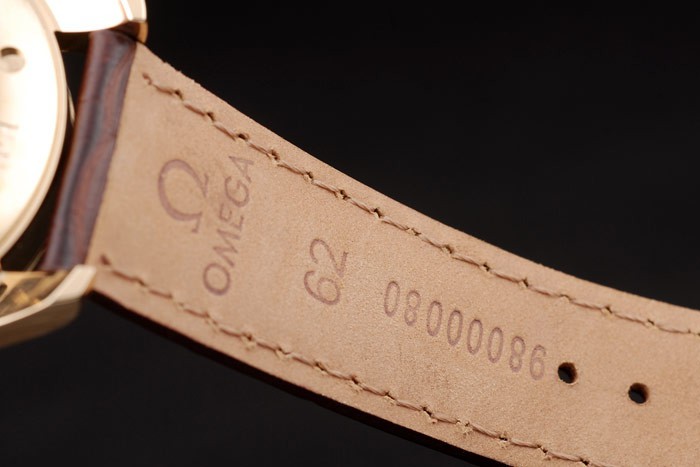 Bransoletka: Brązowy skórzany pasek krokodyla z wytłoczonym pieczęcią Omega i Omega wpisane 18-krotnie żółte złote zapięcie