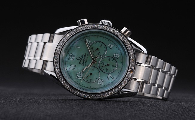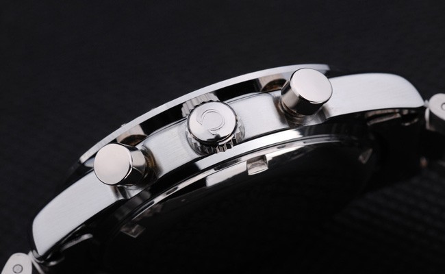 Korona: polerowana korona w przecięciu ze stali nierdzewnej z logo Omega oraz dwie dodatkowe korony, jedna po obu stronach