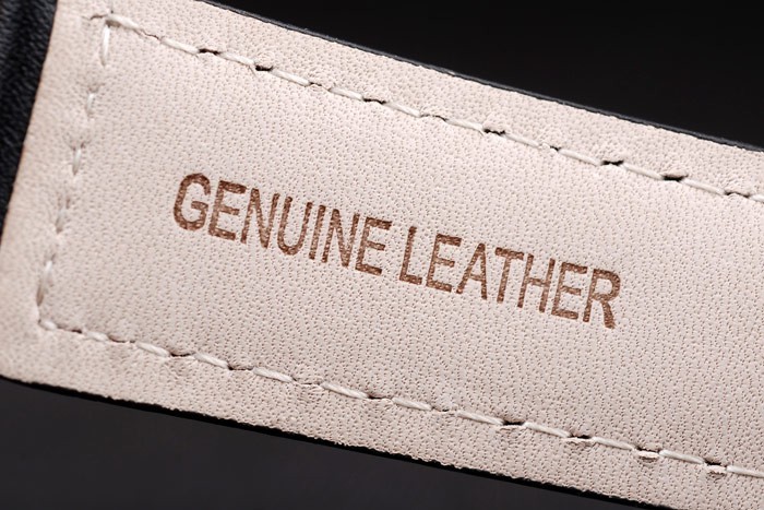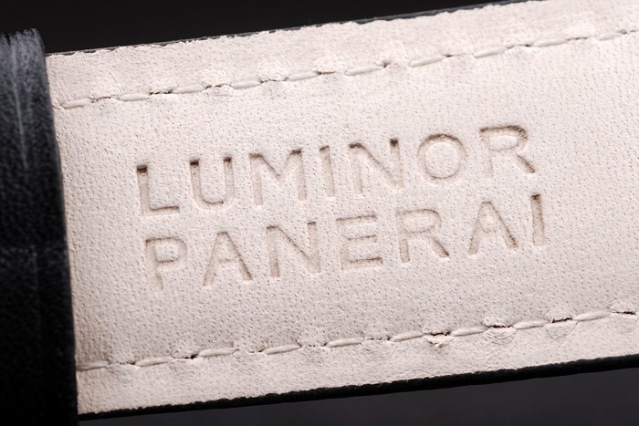 Bransoletka: czarny skórzany pasek z wytłoczonym ogrzewanym pieczęcią Luminor Panerai i jonowym zapięciem ze stali nierdzewnej z grawerowaniem panerai