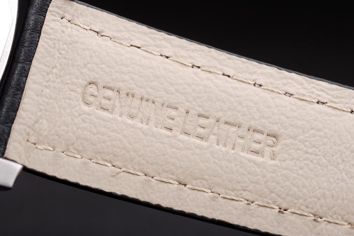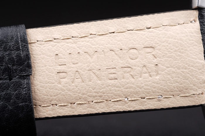 Bransoletka: czarny skórzany pasek z białym szwem i wytłoczonym pieczęcią Luminor Panerai i szczotkowanym zapięciem ze stali nierdzewnej z grawerowaniem panerai