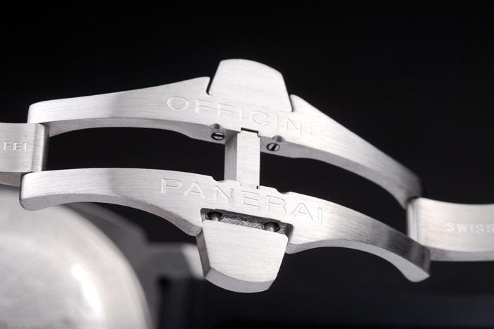Ten zegarek ma kieliszek AR. Kolor twarzy pojawi się różne kolory w zależności od tego, jak światło spada na Itbacka: szczotkowane stali nierdzewne uderzanie z warsztatami Panerai Grawerowanie