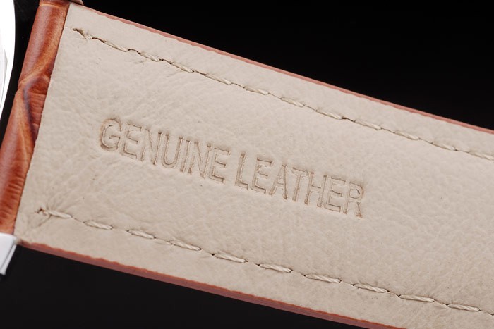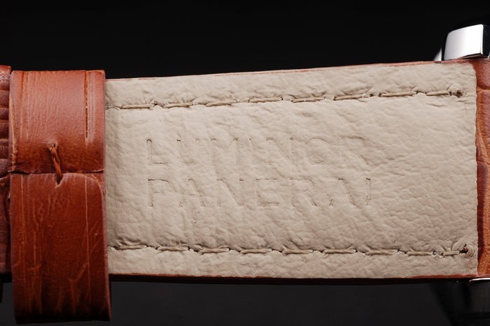 Bransoletka: brązowy skórzany pasek z białym szwem i wytłoczonym ogrzewaniem pieczęć Luminor Panerai i wypolerowane hak ze stali nierdzewnej -Buckle z grawerowaniem panerai