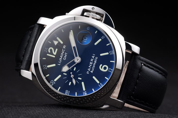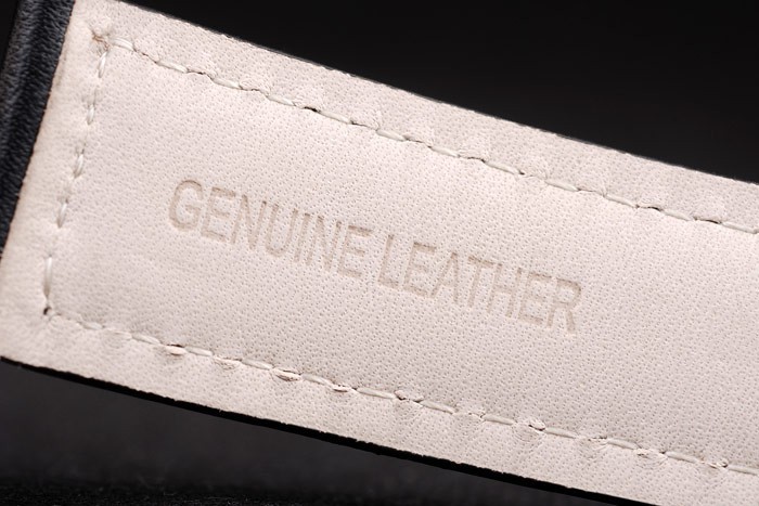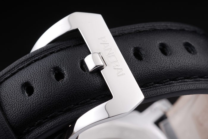 Bransoletka: czarny skórzany pasek z wytłoczonym ogrzewaniem pieczęci Luminor Panerai i wypolerowanym stali nierdzewnym zapięciem-boczkową z grawerowaniem panerai