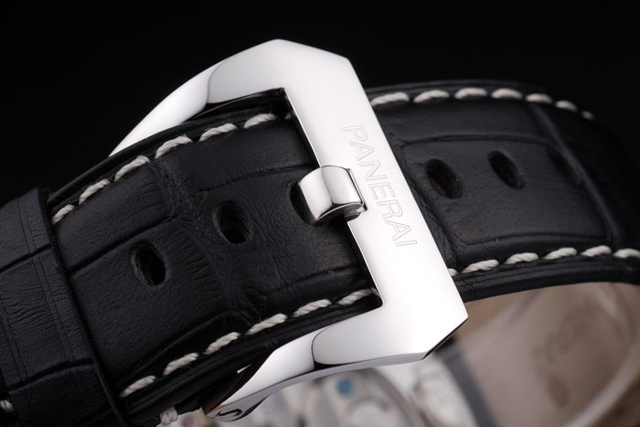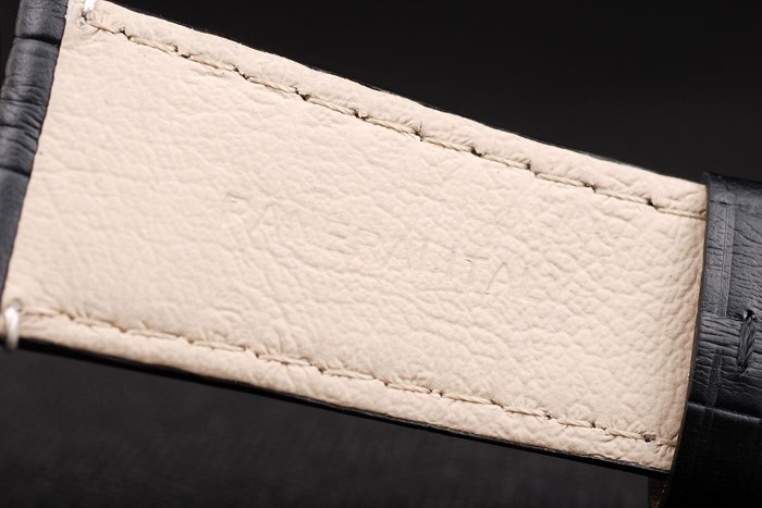 Bransoletka: Czarny skórzany pasek krokodyla z białymi szwami i wytłoczonymi cieplnymi warsztatami Panerai Włoch Włochy i wypolerowane stali nierdzewne zapięcie na haczyek z grawerowaniem Panerai