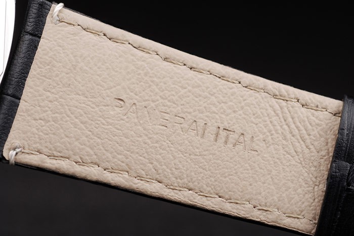 Bransoletka: Czarny skórzany pasek krokodyla z białym szwem i wytłoczonymi warsztatami Haei Włochy i szczotkowane zapięcie ze stali nierdzewnej z grawerowaniem panerai