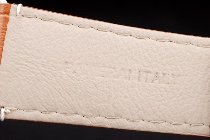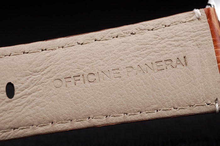 Bransoletka: Brązowy skórzany pasek krokodyla z białym szwem i wytłoczonymi warsztatami Haei Włochy i wypolerowane stal nierdzewna zapięcie na haczyek z grawerowaniem Panerai