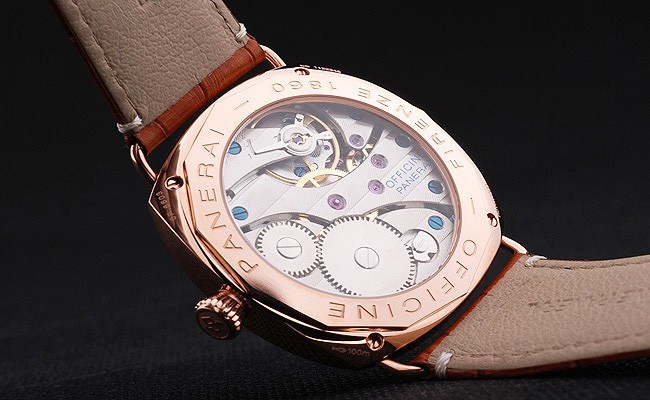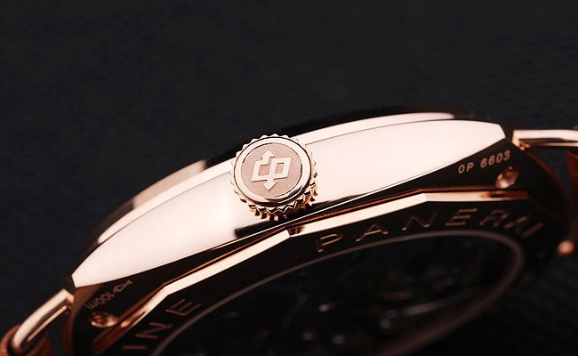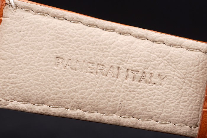 Ten zegarek ma kieliszek AR. Kolor twarzy pojawi się różne kolory w zależności od tego, jak światło spadnie na itbacku: śruba, solidna stal nierdzewna 440, grawerowana nazwa Panerai