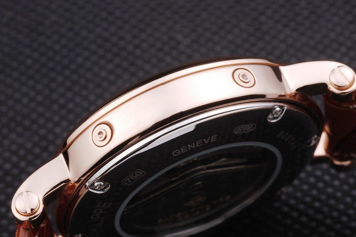 Bransoletka: Brązowy skórzany pasek z pieczęcią Parpe Philippe i różowo -złotym fałdem w zapięciu