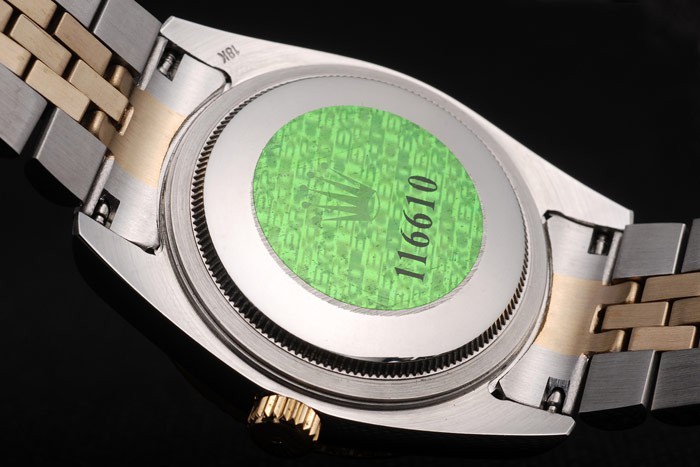 Powrót: obudowa ze stali nierdzewnej z tyłu z zielonym znaczkiem logo Rolex