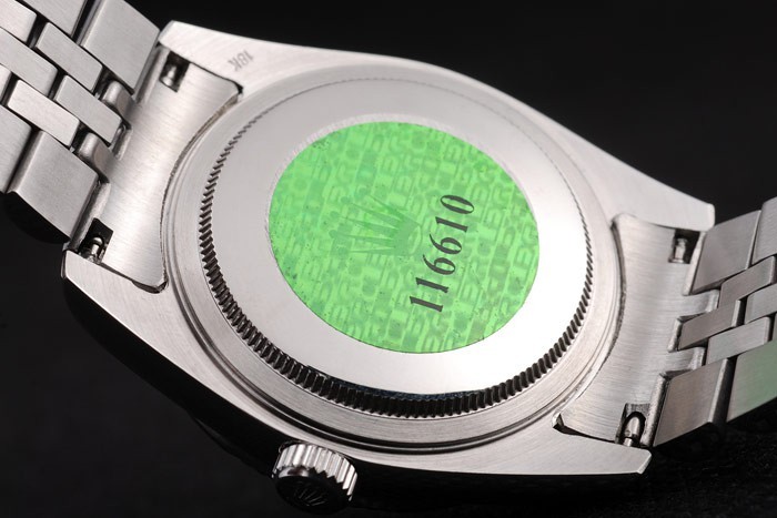 Powrót: obudowa ze stali nierdzewnej z tyłu z zielonym znaczkiem logo Rolex