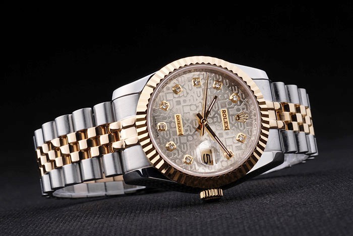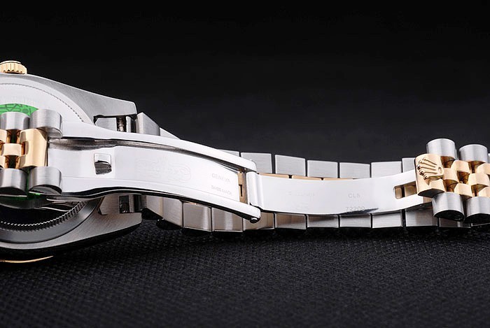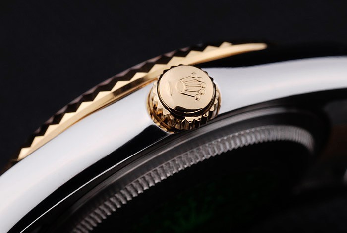 This watch is a real beauty. The case is made of stainless steel and the dial is a deep green. The movement is kinetic (automatic) and the quality is Japanese Miyota. The bracelet is a two-tone brushed stainless steel bracelet with an 18-karat gold Rolex engraving. The clasp is hidden and displays the Rolex logo. The bracelet length is 190 x 20 mm. The bezel is 18k yellow gold plated stainless steel. The diameter is 45 x 37 mm. The watch clasp is a deployment clasp. The crystal is sapphire crystal. The crown is an 18k yellow gold stainless steel crown with the Rolex logo. The case thickness is 13 mm.