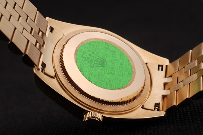 Wstecz: Odprzyj 18 -karatowymi żółtym złotem z zieloną naklejką i oznaczenia Rolex