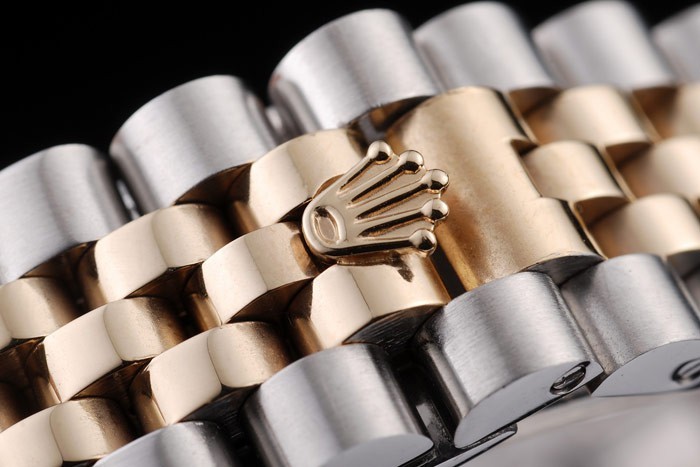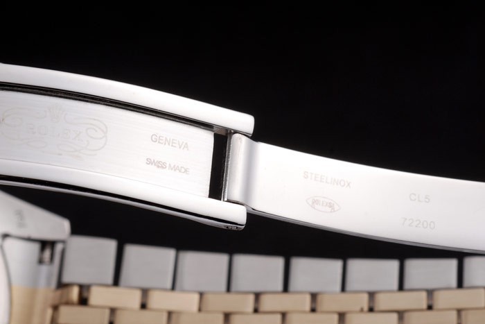 Bransoletka: Dwie stonowana bransoletka ogniwa w szczotkowanej stali ze stali nierdzewnej i 18 -karatowa stalowa ze stali z żółtą złotą z grawerowanym Rolexem ukrytym zapięciem wyświetlającym logo Rolex