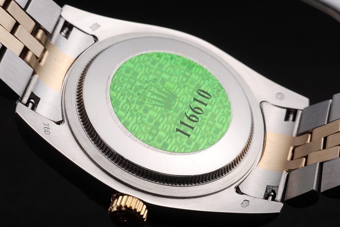 Powrót: obudowa ze stali nierdzewnej z tyłu z zielonym znaczkiem logo Rolex