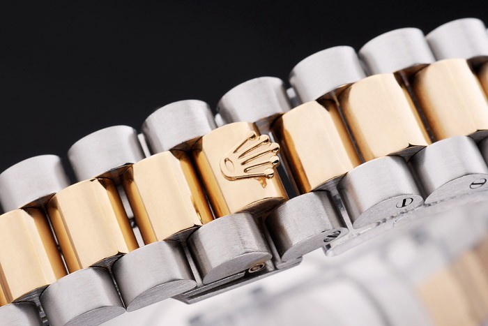 Bransoletka: szczotkowana stal ze stali nierdzewnej i żółty złoto Łańcuch łącza z fałdem nad zapięciem i Rolex Crown Grawerowanie