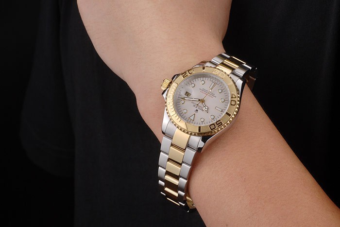 Bransoletka: Dwie stonowane szczotkowane i złotą stalową bransoletkę ze stali nierdzewnej z Rolex Grawerowanie fałdowania w zapięciu Wyświetlając logo Rolex