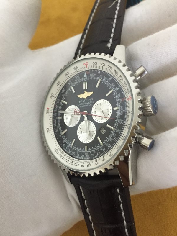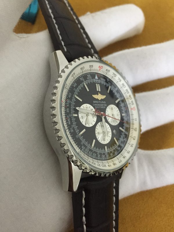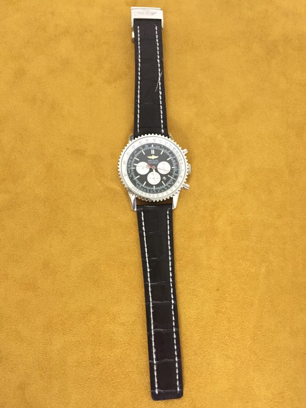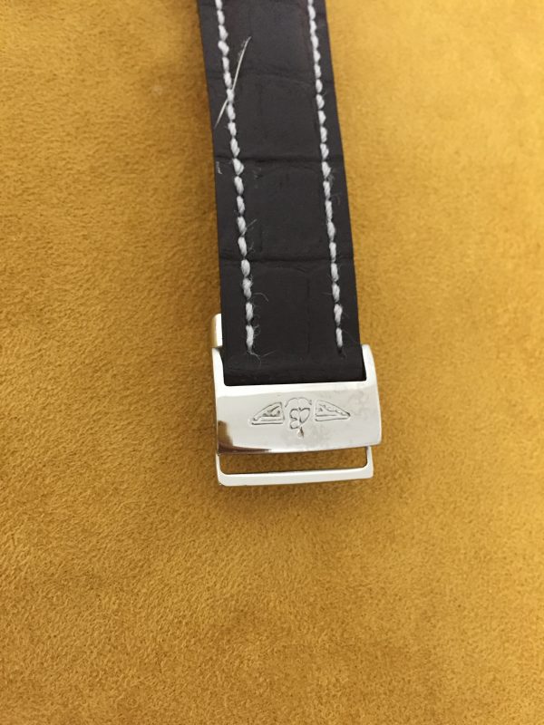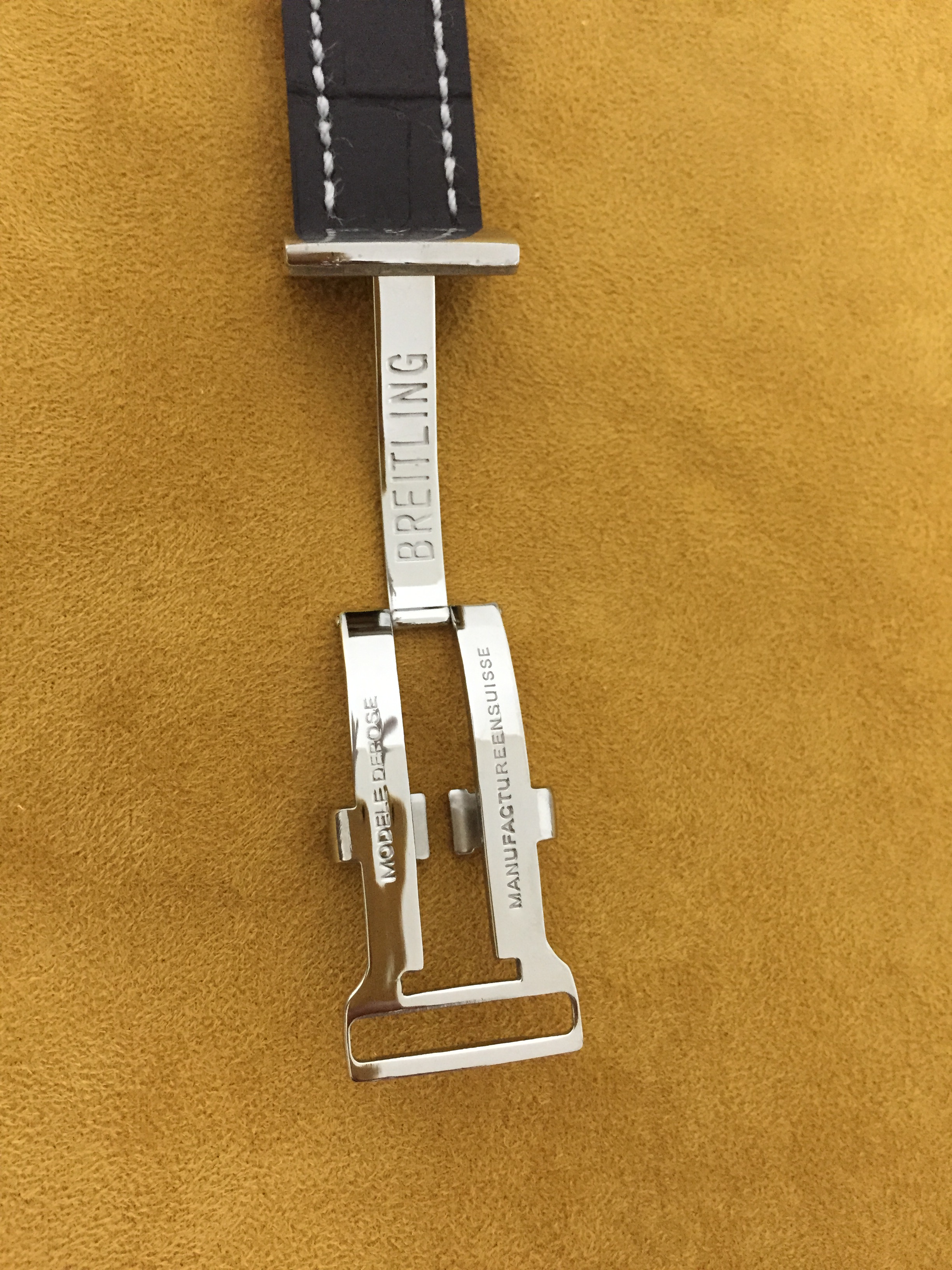 Bransoletka: ciepło wytłoczony skórzany pasek czarny krokodyl skórzany cuir True z białą nitką i logo Breitling grawerowane ze stali nierdzewnej zamykanie złoża lucido